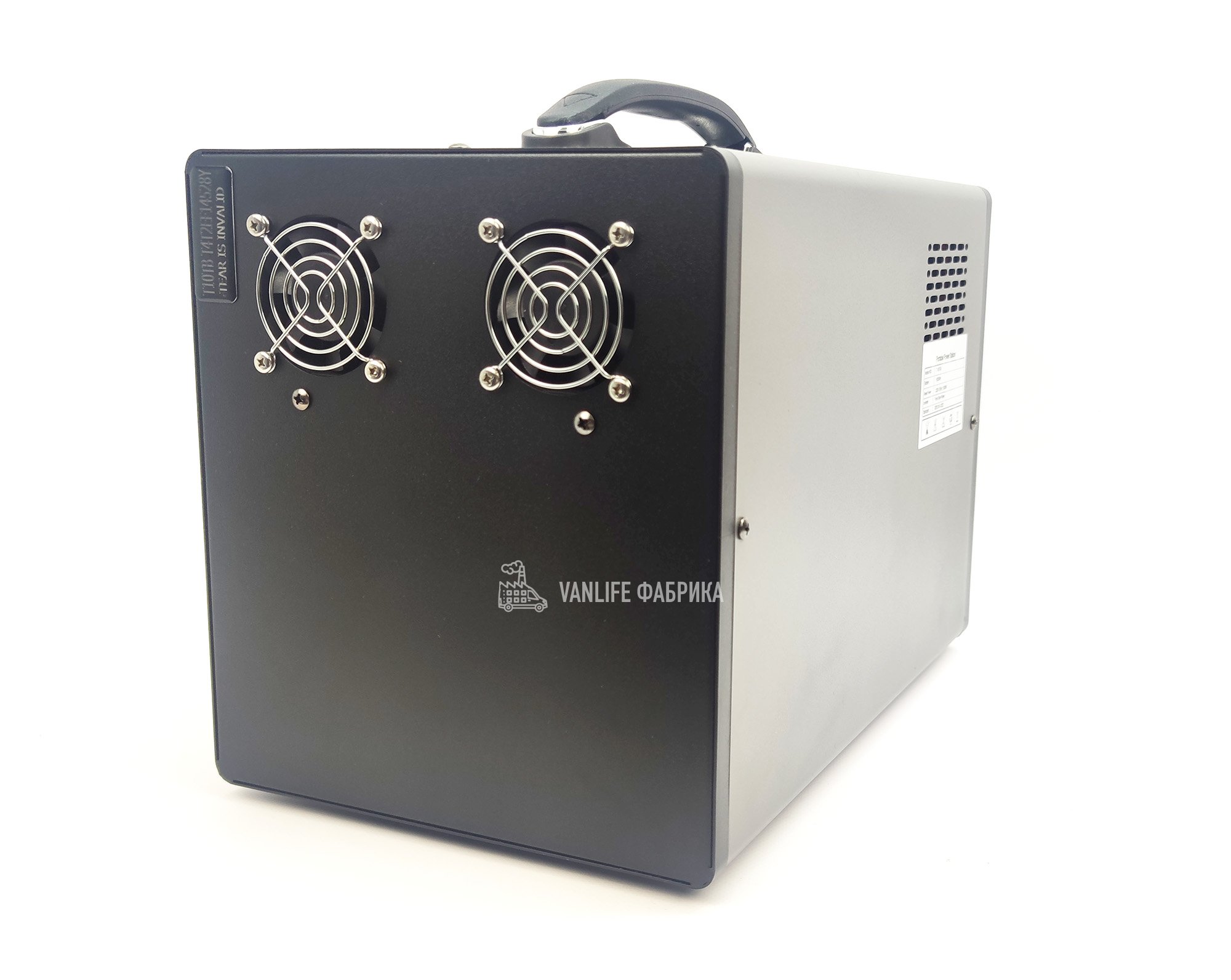 Корпус выполнен из металла, что обеспечивает защиту аккумуляторов. Для охлаждения мощного инвертора 1.5кВт на задней панели установлены два высокопроизводительных вентилятора. Подключение зарядного устройства осуществляется через надежный силовой разъем XT90.