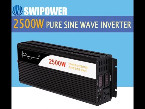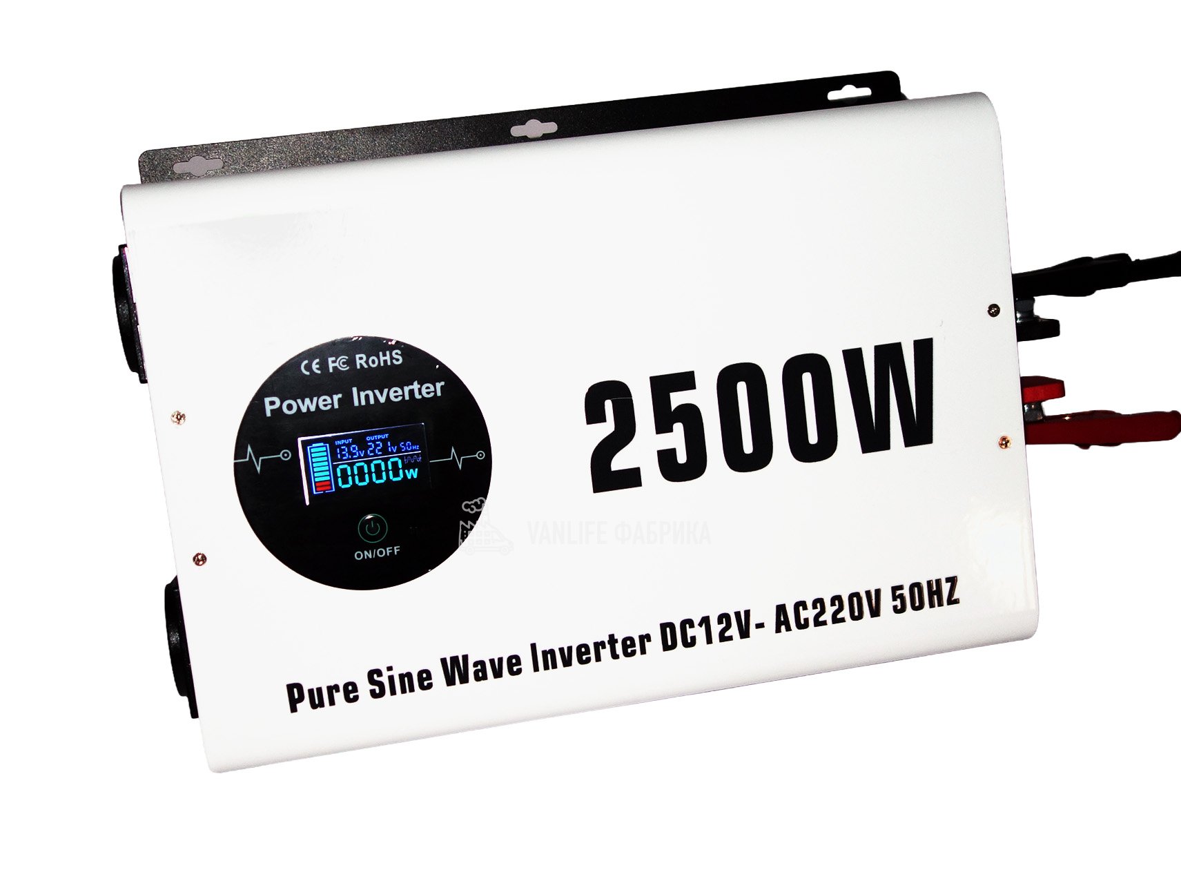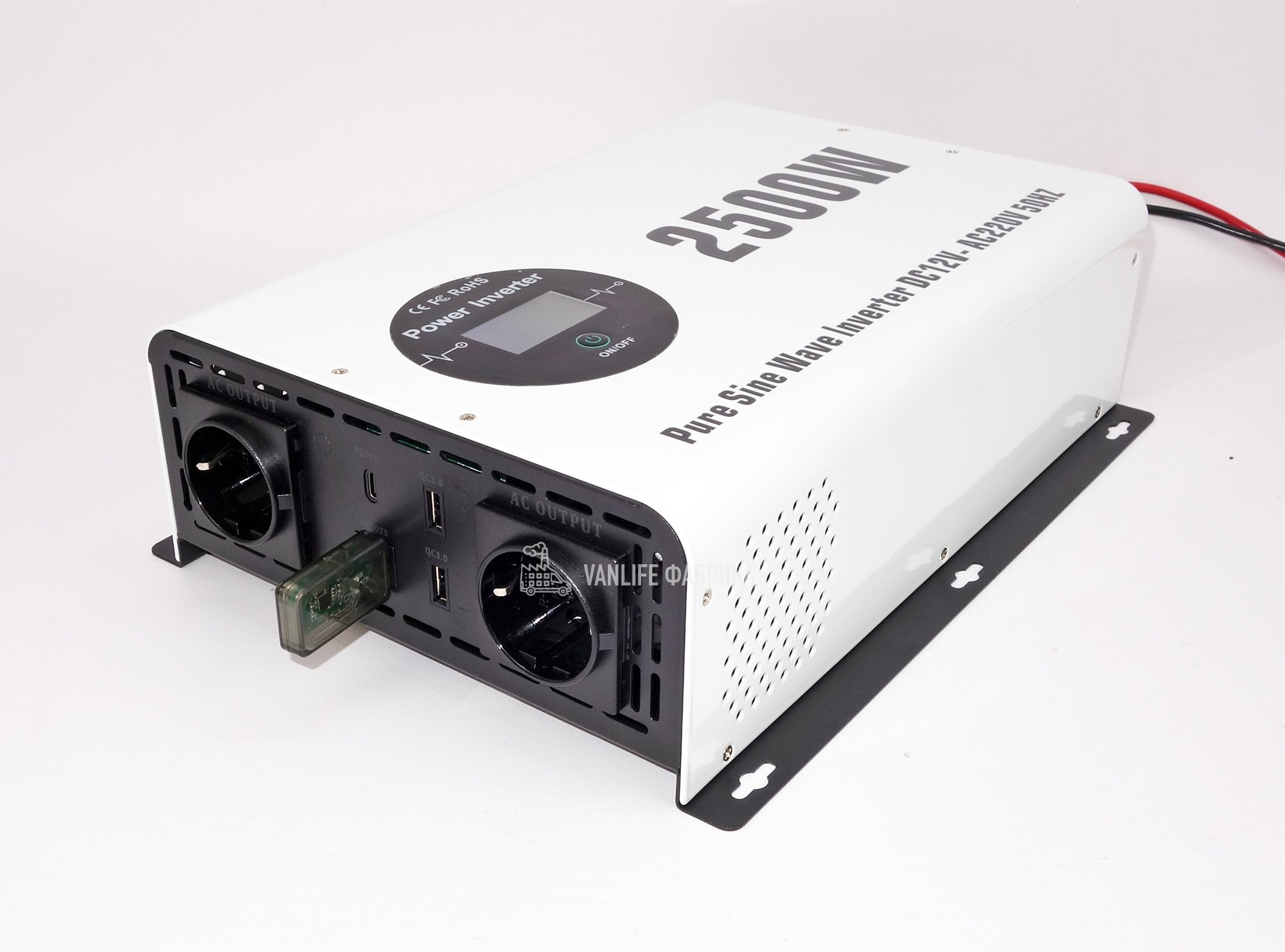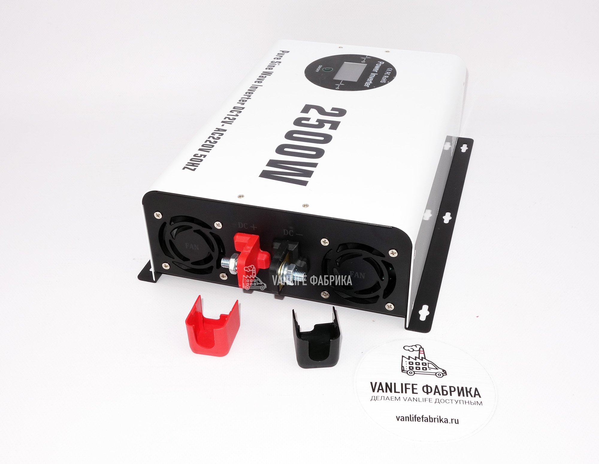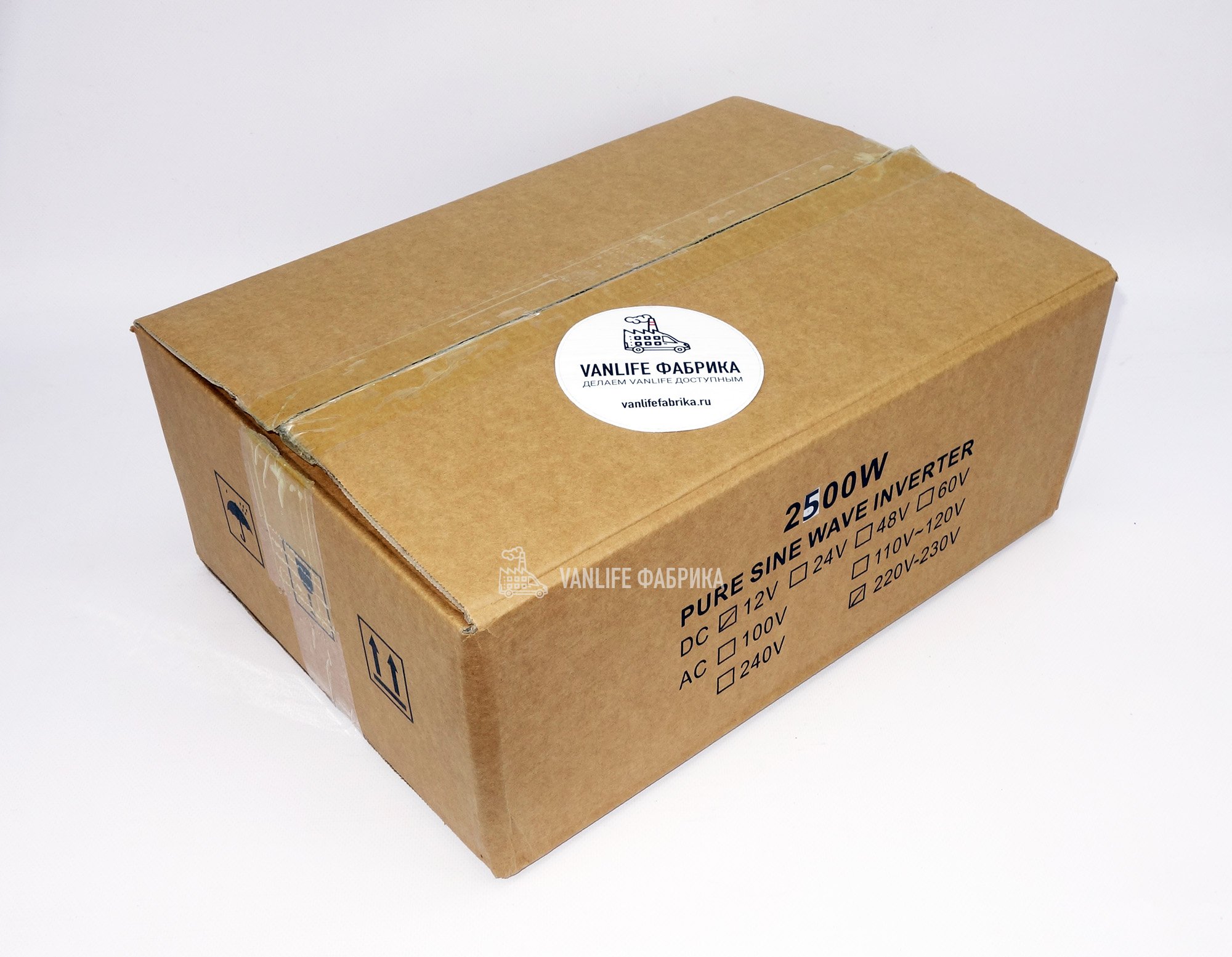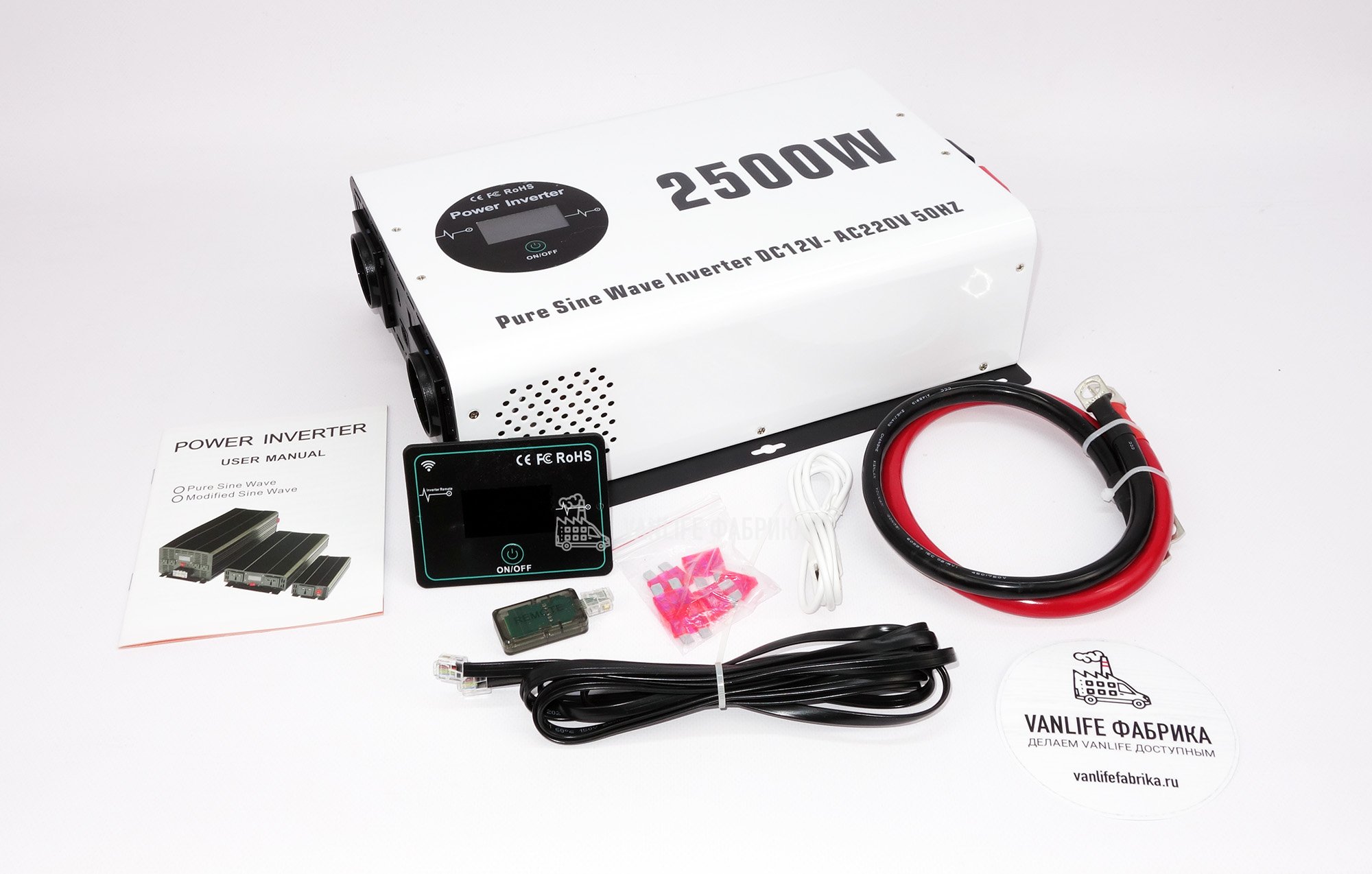 В коробке: инвертор 2500Вт, толстые силовые провода (рекомендуем использовать минимальную длину), беспроводной пульт с модулем связи, набор запасных предохранителей и инструкция.