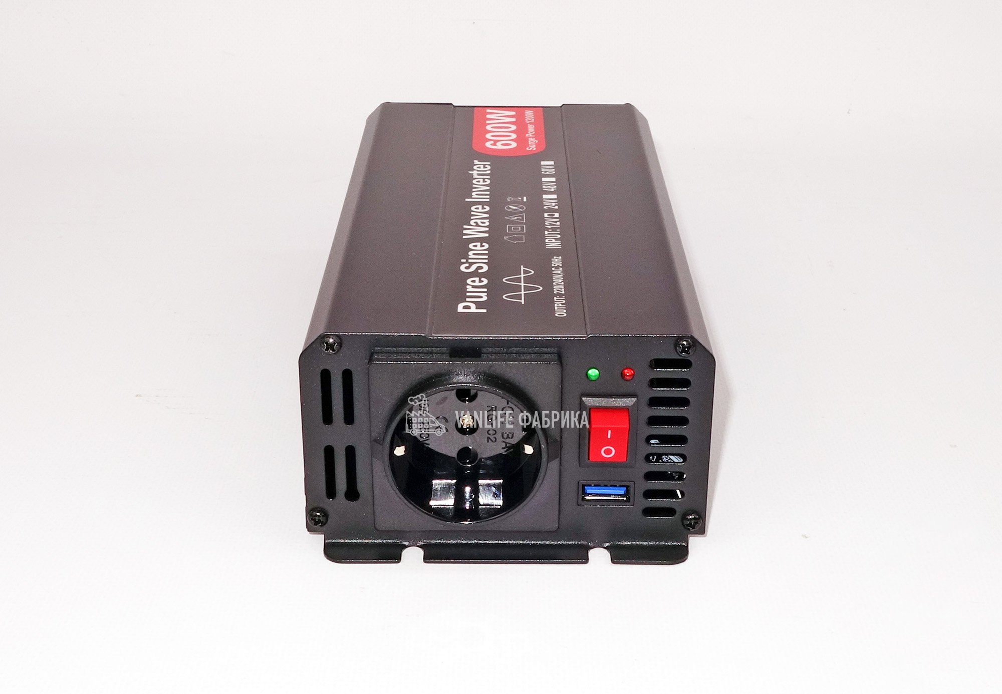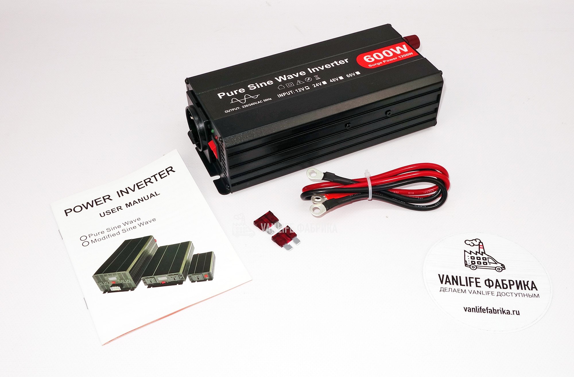 Инвертор поставляется полностью готовым к установке. В комплекте: провода с надежными клеммами для подключения к аккумулятору, запасные предохранители и инструкция.