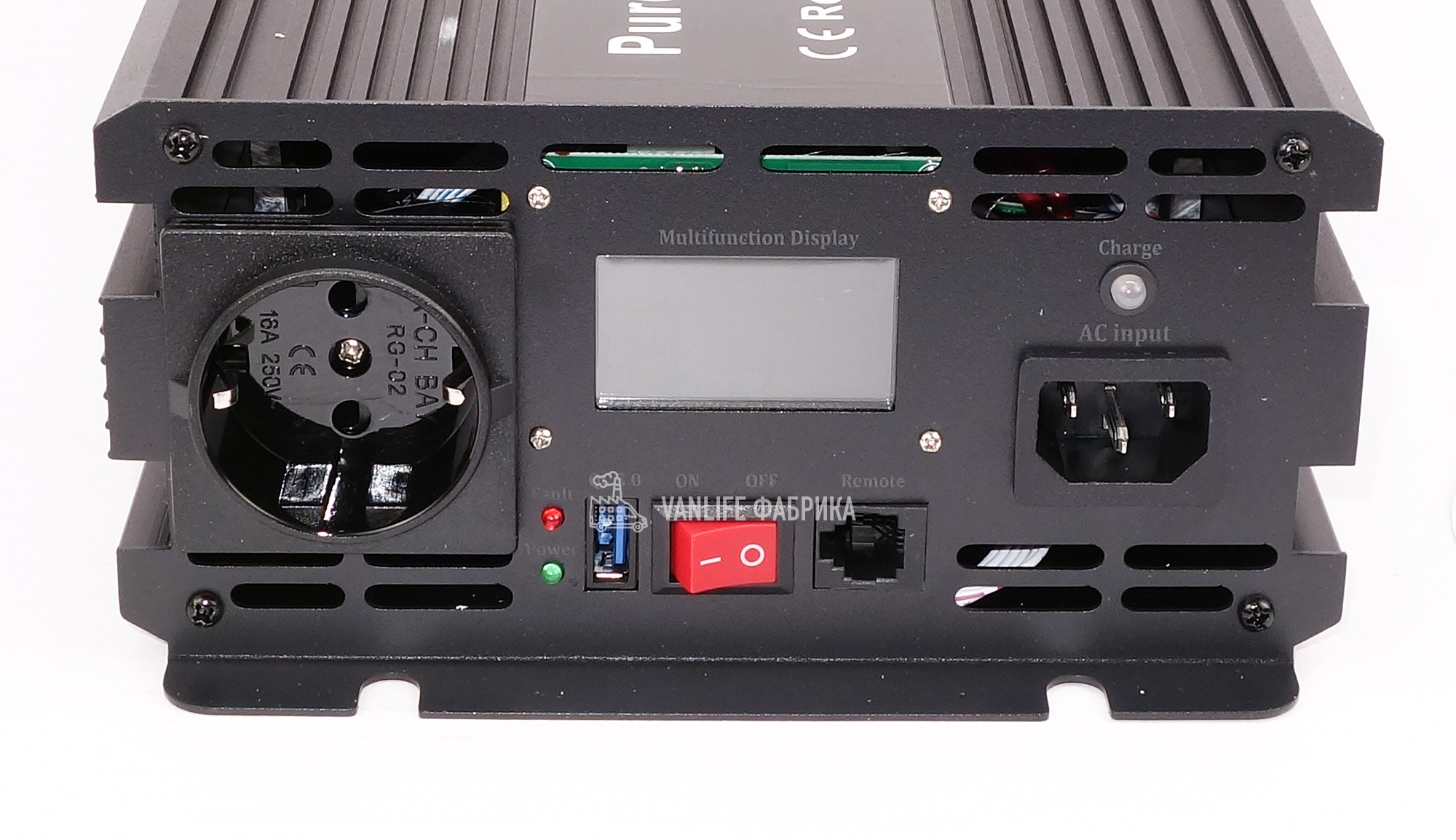 Инвертор выполнен в прочном ребристом корпусе из алюминия черного цвета. На передней панели удобно скомпонованы все элементы управления: евророзетка, разъем для подключения сети (IEC), USB-порт и информативный дисплей.