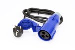 Адаптер соединяет стандартную евро-вилку (Schuko) с влагозащищенной синей кемпинговой розеткой (CEE), которая подключается непосредственно к бортовому вводу автодома или к вашему основному кемперному удлинителю.