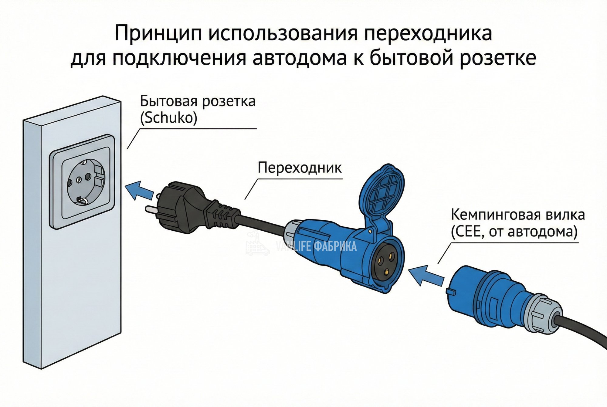 Этот переходник незаменим, если вам нужно зарядить аккумуляторы или охладить холодильник автодома перед поездкой от обычной розетки в гараже или на даче. Он также выручит в кемпингах, где на щитках установлены обычные бытовые розетки вместо специализированных кемпинговых.